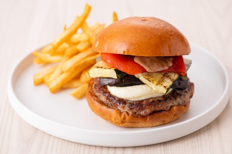 噛むほどに広がるジューシーな豚肉の力強い旨味にフェンネルやガーリックが香り立つサルシッチャにくわえ、グリルで甘みを引き出したパプリカ、ナス、ズッキーニ、そしてモッツァレラチーズを重ねることで、豊かな味わいの層を作り出しました。まろやかなマヨネーズにバルサミコ酢を合わせたソースが、甘酸っぱさとコクをプラスしています。トスカーナの食卓を思わせる贅沢バーガーをお楽しみください。